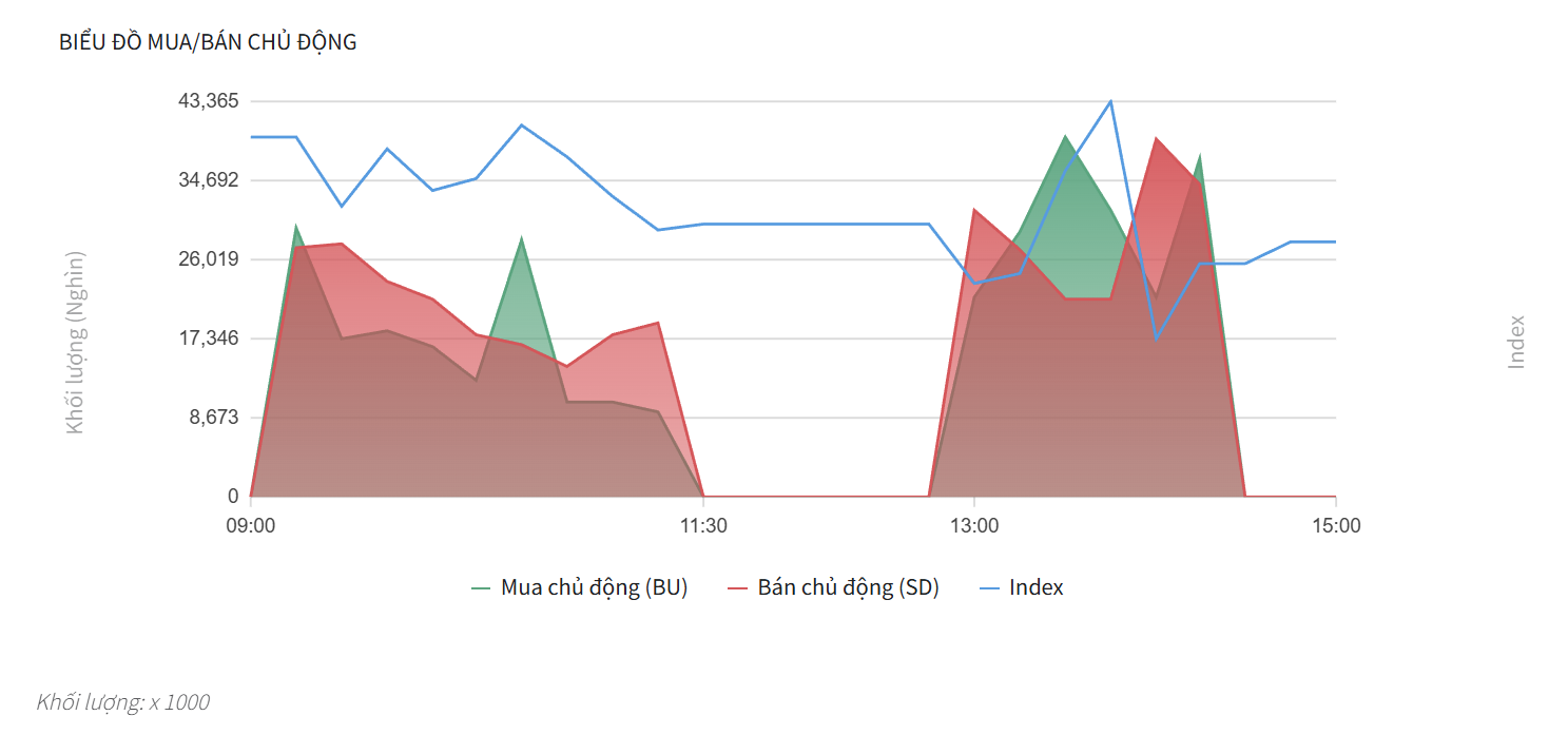 • Ngay khi bắt đầu phiên chiều, phe mua đã chủ động gia tăng xung lực giúp Index có nhịp hồi phục nhẹ. Cao điểm là khoảng 13:45, lực mua bùng nổ mạnh mẽ, tạo nên một cột khối lượng mua chủ động cao nhất toàn phiên.