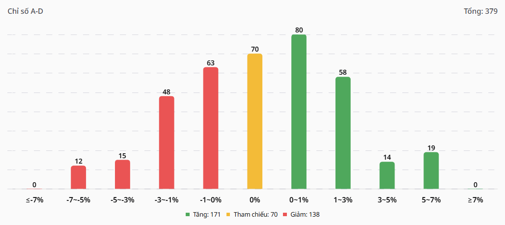 • Thị trường ghi nhận sự cải thiện đáng kể về độ rộng với 171 mã tăng, 138 mã giảm70 mã giữ mức tham chiếu trên tổng số 379 mã được thống kê.