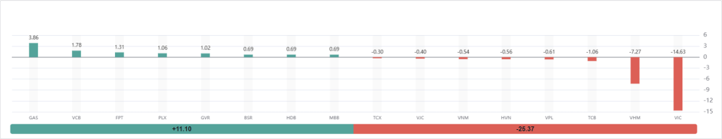 • Nhóm cổ phiếu đóng góp tăng điểm mang lại tổng cộng +11.10 điểm cho chỉ số chung.