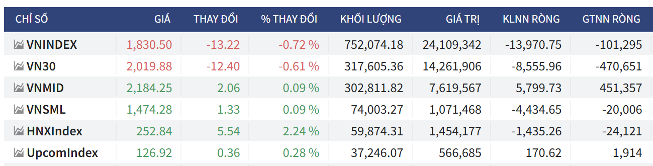 • Đóng cửa tại mức 1,830.50 điểm, giảm -13.22 điểm (tương đương -0.72%) so với phiên trước.