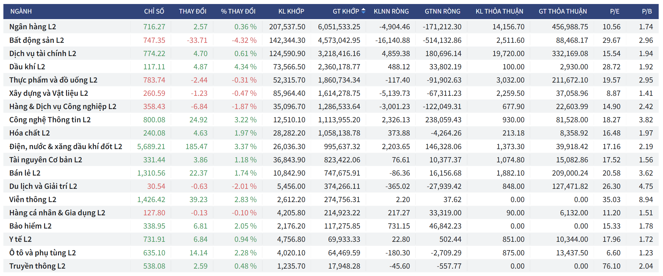 • Xuất hiện sự phân hóa cực đoan: Dòng tiền tháo chạy mạnh khỏi nhóm vốn hóa lớn (đặc biệt là Bất động sản với VIC, VHM) nhưng lại lan tỏa tích cực sang nhóm Midcap và Smallcap, giúp HNX-Index ngược dòng tăng mạnh +2.24%.