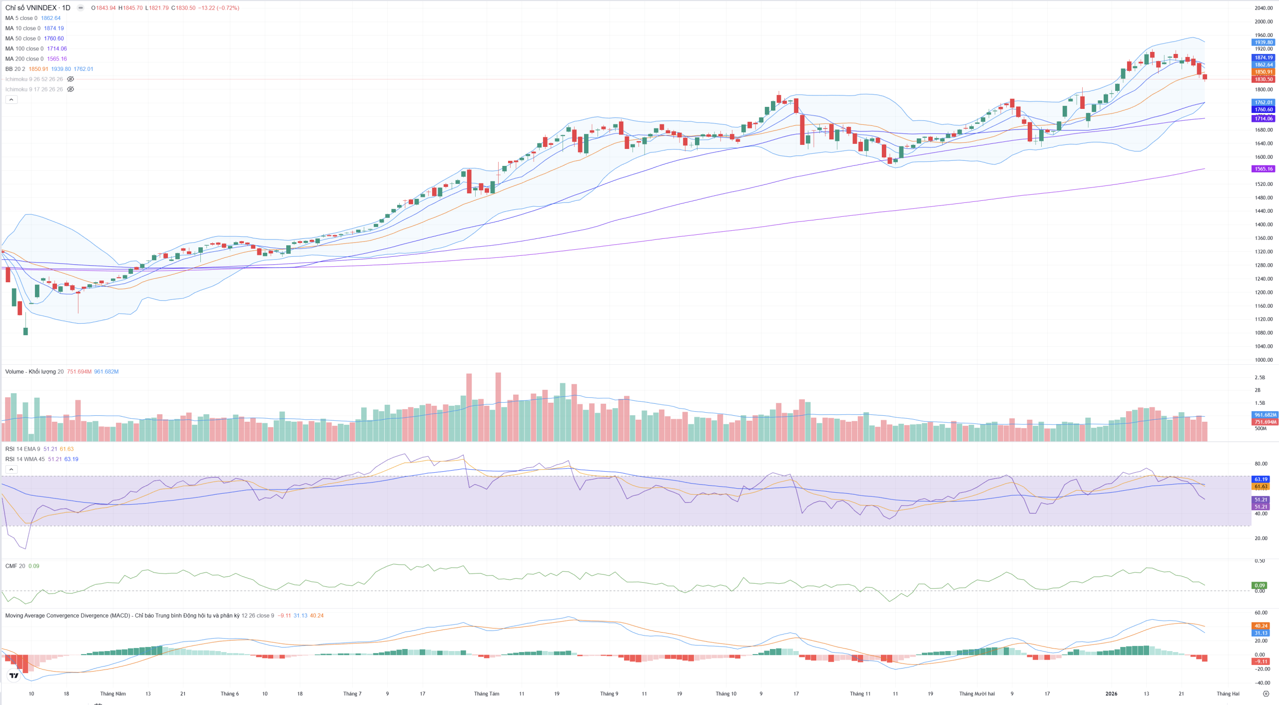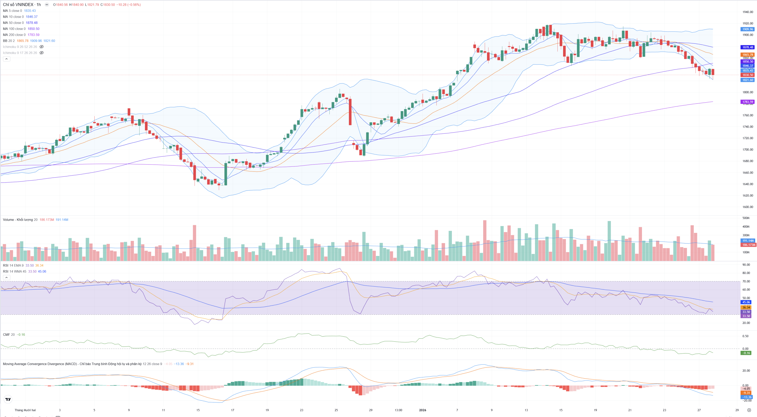 Kết luận sơ bộ: Đồ thị khung H1 phiên 27/01/2026 cho thấy áp lực điều chỉnh vẫn đang hiện hữu khi các chỉ báo xung lực (MACD, RSI) và dòng tiền (CMF) đều ở trạng thái tiêu cực. Mặc dù chỉ số đã có phản ứng tại ngưỡng 1,821, nhưng việc chưa thể lấy lại đường MA5 và MA100 khiến xu hướng ngắn hạn vẫn nghiêng về kịch bản tích lũy hoặc kiểm định lại vùng đáy vừa thiết lập trước khi có nhịp hồi rõ nét.