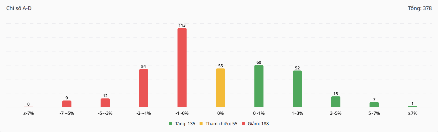 - Áp lực giảm giá tập trung mạnh nhất ở biên độ hẹp từ -1% đến 0% với 113 mã.