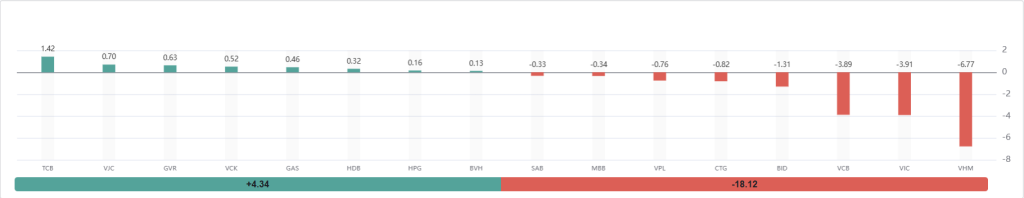 - VIC (Vingroup): Sau hai phiên kéo thốc, VIC đã quay đầu giảm điểm, tác động tiêu cực -3,91 điểm.