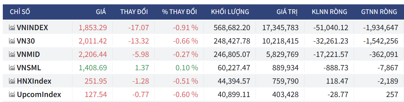 - Chốt phiên, VN-Index giảm 17,07 điểm (-0,91%), xuống 1.853,29 điểm; HNX-Index giảm 1,28 điểm (-0,51%), xuống 251,95 điểm; UpCoM-Index giảm 0,77 điểm (-0,60%), xuống 127,54 điểm