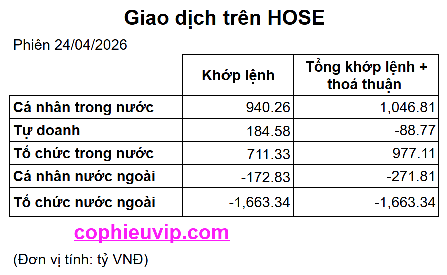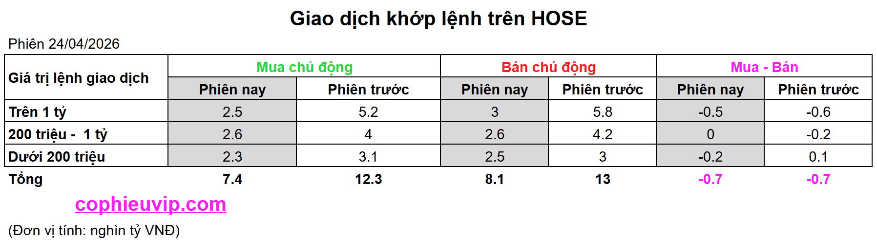 Dữ liệu thống kê ngày 24/04/2026 cho thấy độ rộng thị trường mặc dù vẫn nghiêng về sắc đỏ nhưng đã có sự cải thiện nhẹ về số lượng mã tăng so với phiên “kéo trụ xả hàng” ngày 23/04 (tăng từ 104 mã lên 135 mã). Tuy nhiên, việc VN-Index giảm sâu hơn 17 điểm trong khi số mã giảm vẫn chiếm gần 50% cho thấy áp lực bán đang tập trung rất mạnh vào các mã vốn hóa lớn (như VHM, VIC, VCB đã phân tích). Thị trường đang bước vào nhịp điều chỉnh thực sự khi sắc đỏ lan tỏa đều khắp các nhóm ngành, thay vì chỉ tập trung ở nhóm Midcap như phiên trước. Sự sụt giảm của số mã giữ giá tham chiếu và sự gia tăng của nhóm mã tăng nhẹ cho thấy dòng tiền đang có dấu hiệu luân chuyển, tìm kiếm cơ hội ở các mã riêng lẻ chưa tăng nóng, nhưng nhìn chung tâm lý thận trọng vẫn bao trùm toàn sàn.