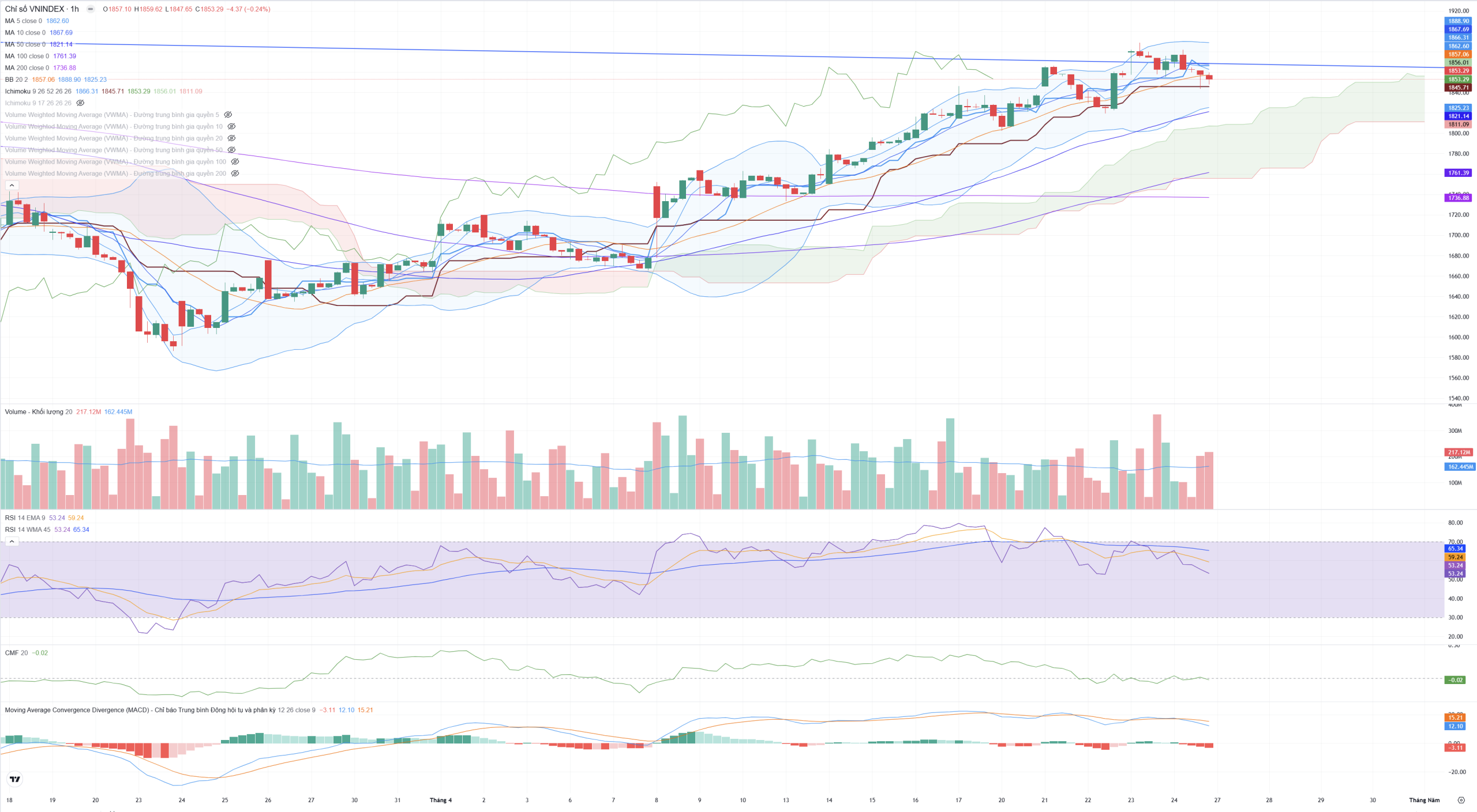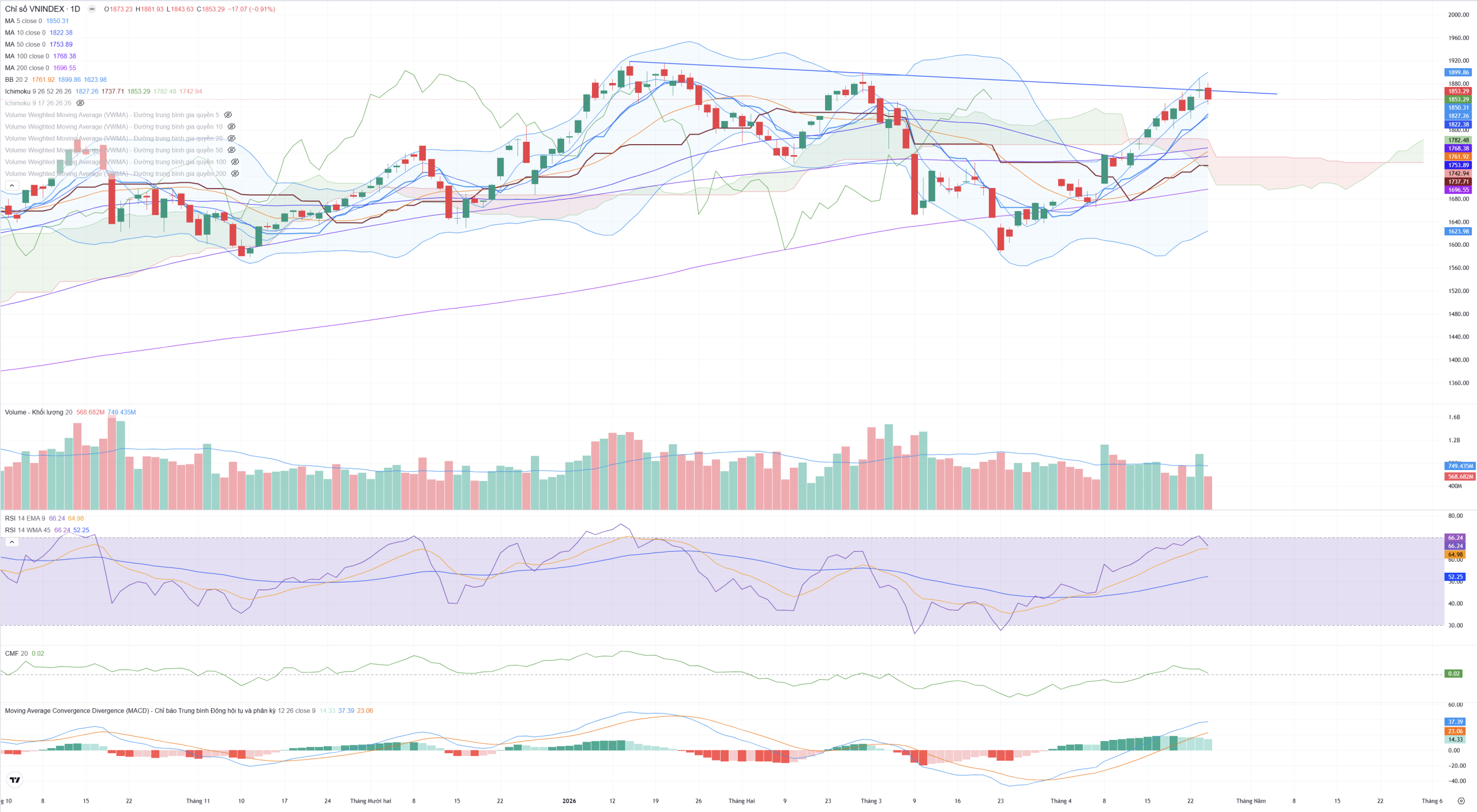 Kết luận sơ bộ Phiên giao dịch ngày 24/04/2026 là phiên xác nhận xu hướng điều chỉnh sau tín hiệu cảnh báo từ phiên phân phối kỷ lục 23/04. Thị trường đang chịu áp lực kép từ việc “trả điểm” của các mã trụ và sự thận trọng của dòng tiền mới trước kỳ nghỉ lễ dài ngày. Việc RSI thoát vùng quá mua và CMF suy yếu cho thấy sự hưng phấn đã qua đi. Nhà đầu tư nên kiên nhẫn quan sát nhịp kiểm định tại vùng hỗ trợ 1.815 – 1.820 thay vì vội vàng bắt đáy khi các chỉ báo kỹ thuật vẫn chưa cho thấy sự cân bằng.