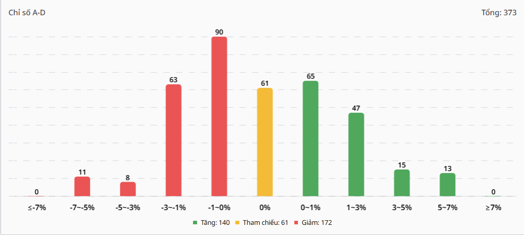 - Sức ép từ nhóm giảm điểm tăng mạnh so với phiên trước, hiện gấp gần 6 lần so với nhóm tăng điểm, cho thấy trạng thái “áp đảo tuyệt đối” của phe bán tại các cổ phiếu trụ cột.