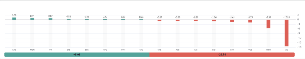 - Các mã khác có tác động tiêu cực bao gồm: GVR (-1.41 điểm), BID (-1.06 điểm), VJC (-0.92 điểm), ACB (-0.88 điểm) và VRE (-0.87 điểm).