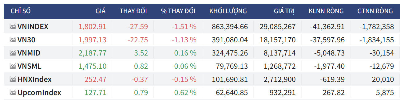 - Chốt phiên, VN-Index giảm 27,59 điểm (-1,51%), xuống 1.802,91 điểm; HNX-Index giảm 0,37 điểm (-0,15%), xuống 252,47 điểm; UpCoM-Index tăng 0,79 điểm (+0,62%), lên 127,71 điểm