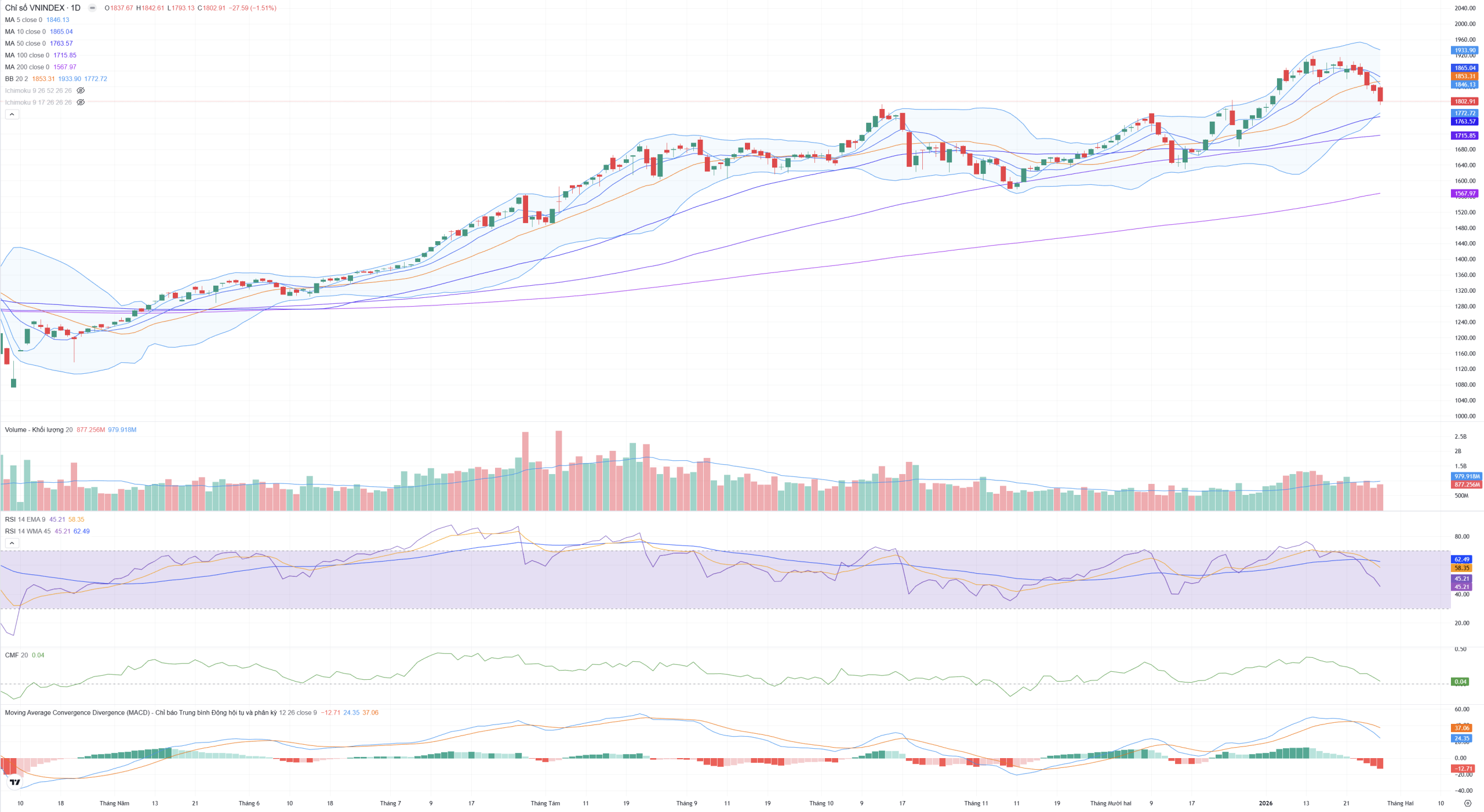 Kết luận sơ bộ: Đồ thị khung H1 phiên 28/01/2026 phản ánh trạng thái giảm điểm mạnh nhưng đã bắt đầu xuất hiện dấu hiệu quá bán cực đại (RSI < 30). Mặc dù nến giờ cuối có sự phản kháng nhẹ giúp chỉ số giữ được mốc 1,800, nhưng với việc dòng tiền (CMF) vẫn rút ra mạnh và các đường MA hướng xuống dốc, thị trường cần một nhịp tích lũy ổn định hơn hoặc một phiên bùng nổ lực cầu để xác nhận đáy ngắn hạn quanh vùng 1,786 – 1,793.