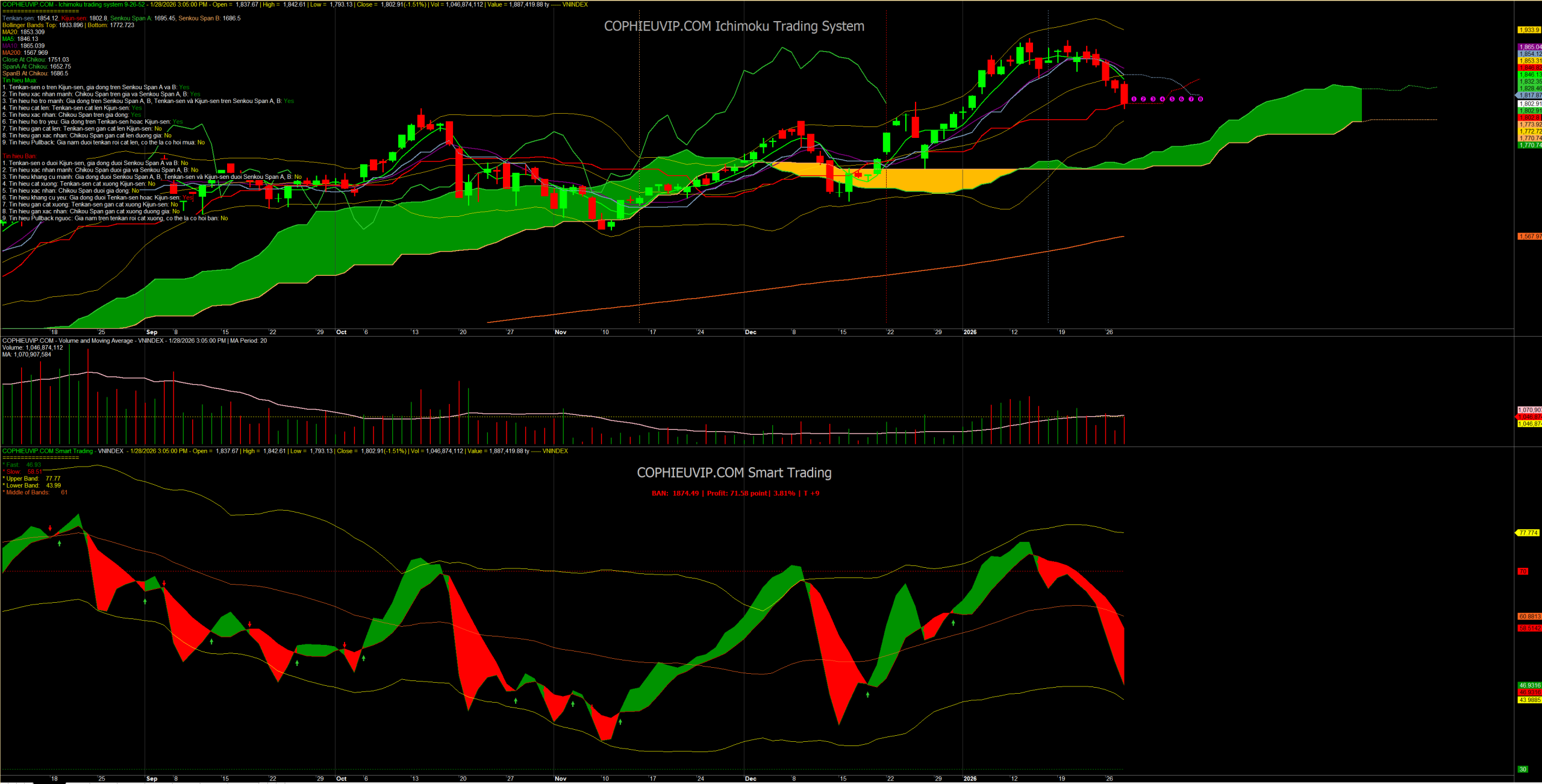 Kết luận sơ bộ: Đồ thị VN-Index phiên 28/01/2026 cho thấy một trạng thái tiêu cực nghiêm trọng khi các mốc hỗ trợ ngắn hạn bị phá vỡ hoàn toàn kèm thanh khoản tăng. Đà giảm hiện tại có sự đồng thuận giữa giá và các chỉ báo xung lực (MACD, RSI), báo hiệu thị trường có thể cần lùi về vùng hỗ trợ trung hạn quanh 1,760 – 1,770 để tìm kiếm lực cầu mới. Nhà đầu tư nên ưu tiên quản trị rủi ro tối đa và tuyệt đối không thực hiện bắt đáy khi chưa xuất hiện các nến đảo chiều có độ tin cậy cao.