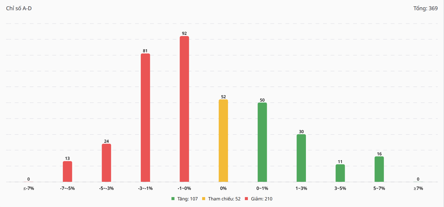 - Áp lực giảm tập trung mạnh nhất ở biên độ hẹp từ -1% đến 0% với 92 mã.
