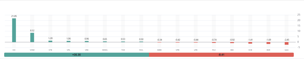 - VHM (Vinhomes): Xếp thứ hai với mức đóng góp +8,52 điểm, hưởng ứng tích cực từ báo cáo lợi nhuận quý 1 tăng trưởng đột biến hơn 800%.