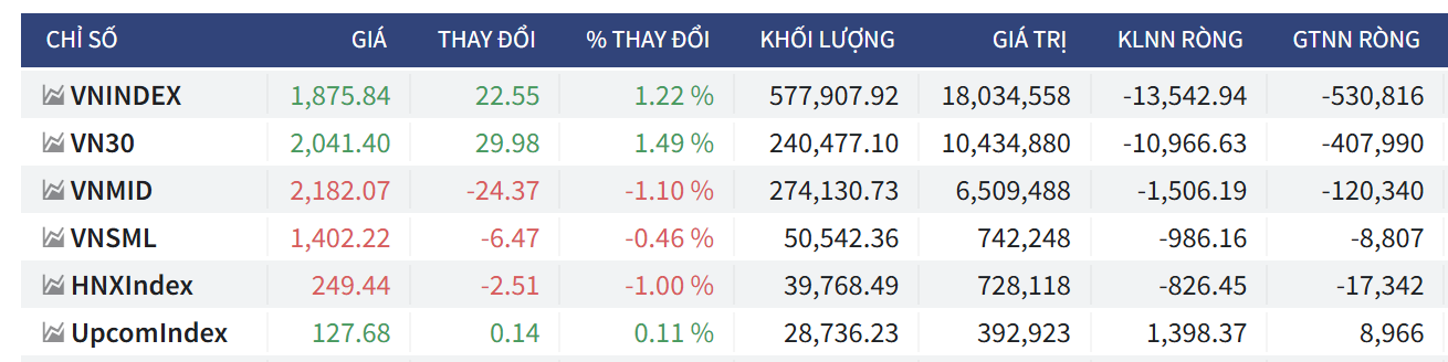 - Chốt phiên, VN-Index tăng 22,55 điểm (+1,22%), lên 1.875,84 điểm; HNX-Index giảm 2,51 điểm (-1,00%), xuống 249,44 điểm; UpCoM-Index tăng 0,14 điểm (+0,11%), lên 127,68 điểm
