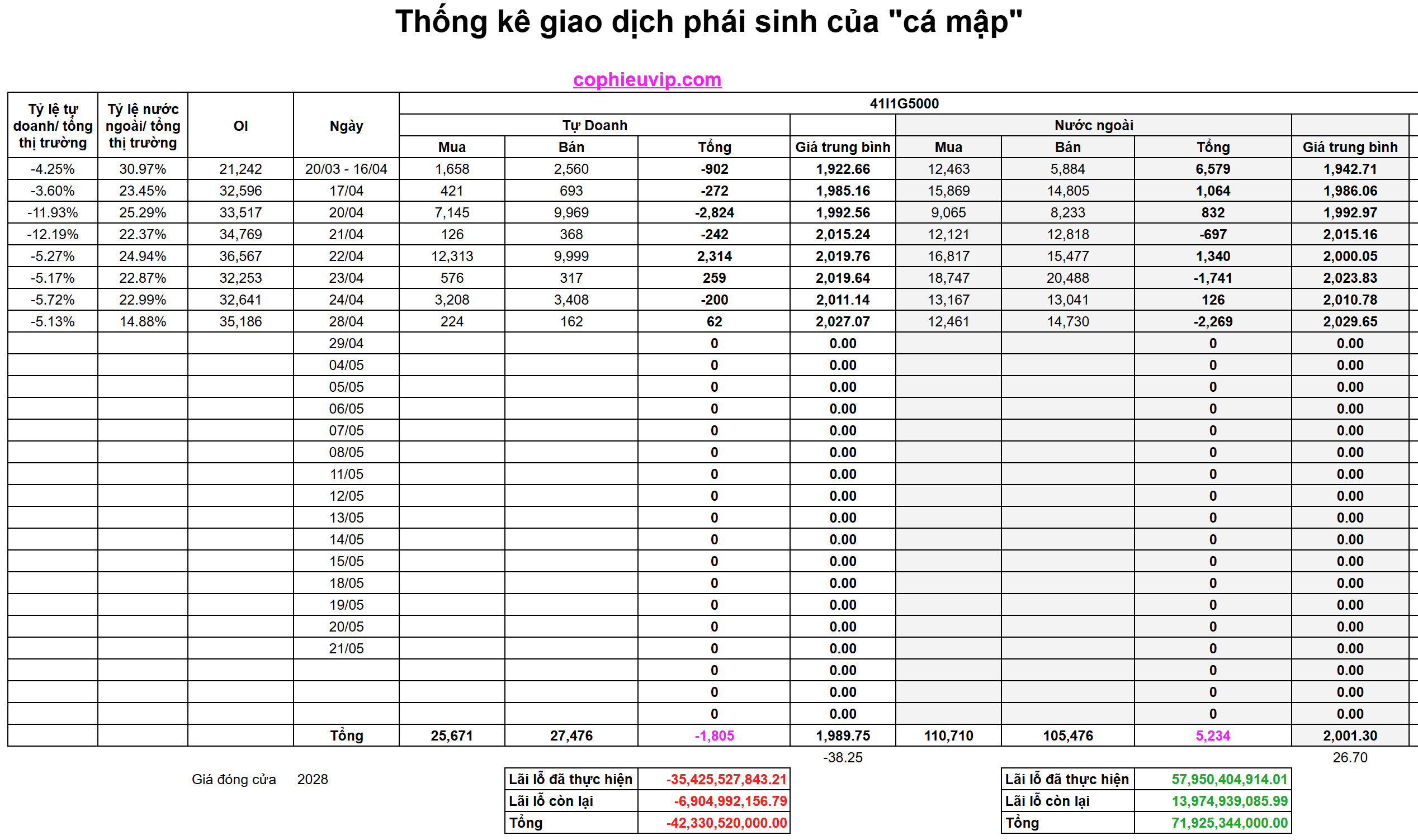 - Vị thế mở (OI): Tăng mạnh lên mức 35.186 hợp đồng (tăng +2.545 so với mức 32.641 của phiên 24/04). Việc OI tăng mạnh đi kèm với Basis âm sâu và giá phái sinh đóng cửa ở mức thấp so với trung bình phiên cho thấy dòng tiền mới đang đổ vào để thiết lập các vị thế Short phòng thủ cực kỳ quyết liệt.