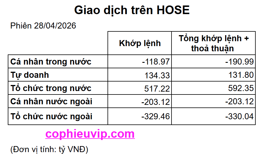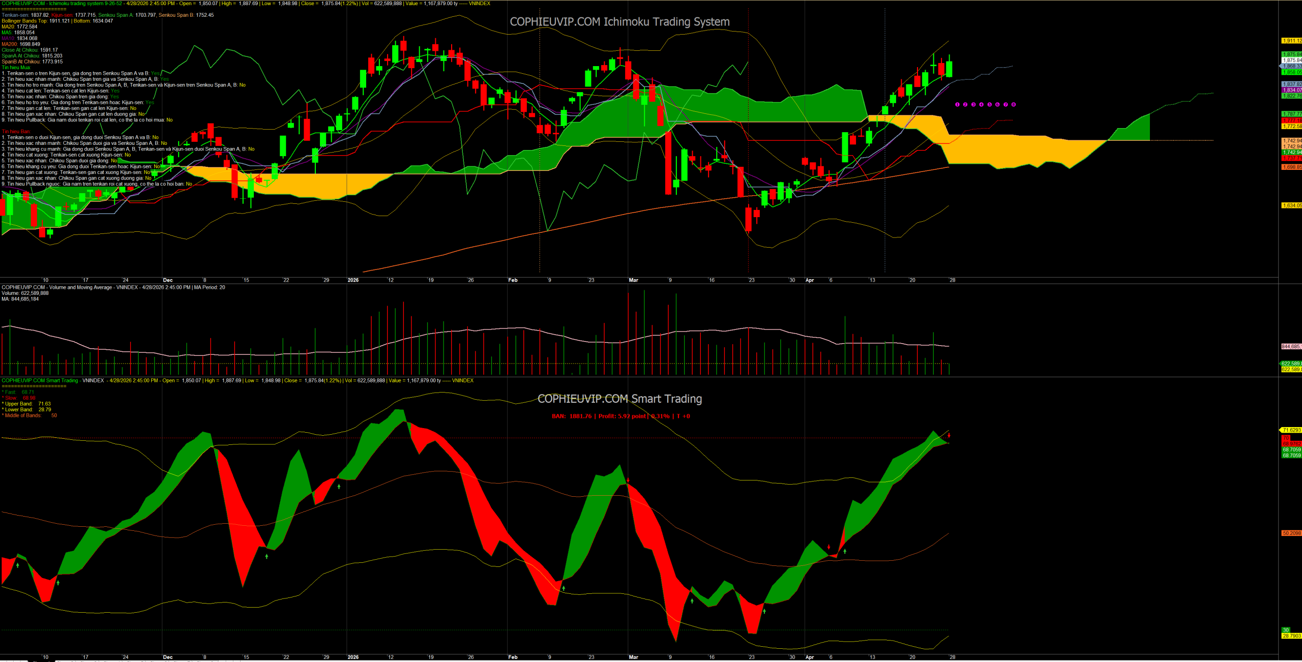 Phiên giao dịch ngày 28/04/2026 mang đậm dấu ấn của nhóm cổ phiếu họ Vingroup (VIC, VHM). Về mặt chỉ số, VN-Index đã có cú lội ngược dòng ngoạn mục, phủ nhận nỗ lực giảm điểm của phiên trước. Tuy nhiên, về mặt kỹ thuật, việc tăng điểm trên nền thanh khoản thấp và độ rộng thị trường tiêu cực là một điểm trừ lớn. Thị trường hiện tại chỉ dành cho các cổ phiếu có câu chuyện riêng và báo cáo lợi nhuận đột biến. Nhà đầu tư cần hết sức tỉnh táo, tránh tâm lý Fomo khi chỉ số tăng mạnh nhưng danh mục cá nhân không tăng, thậm chí giảm.