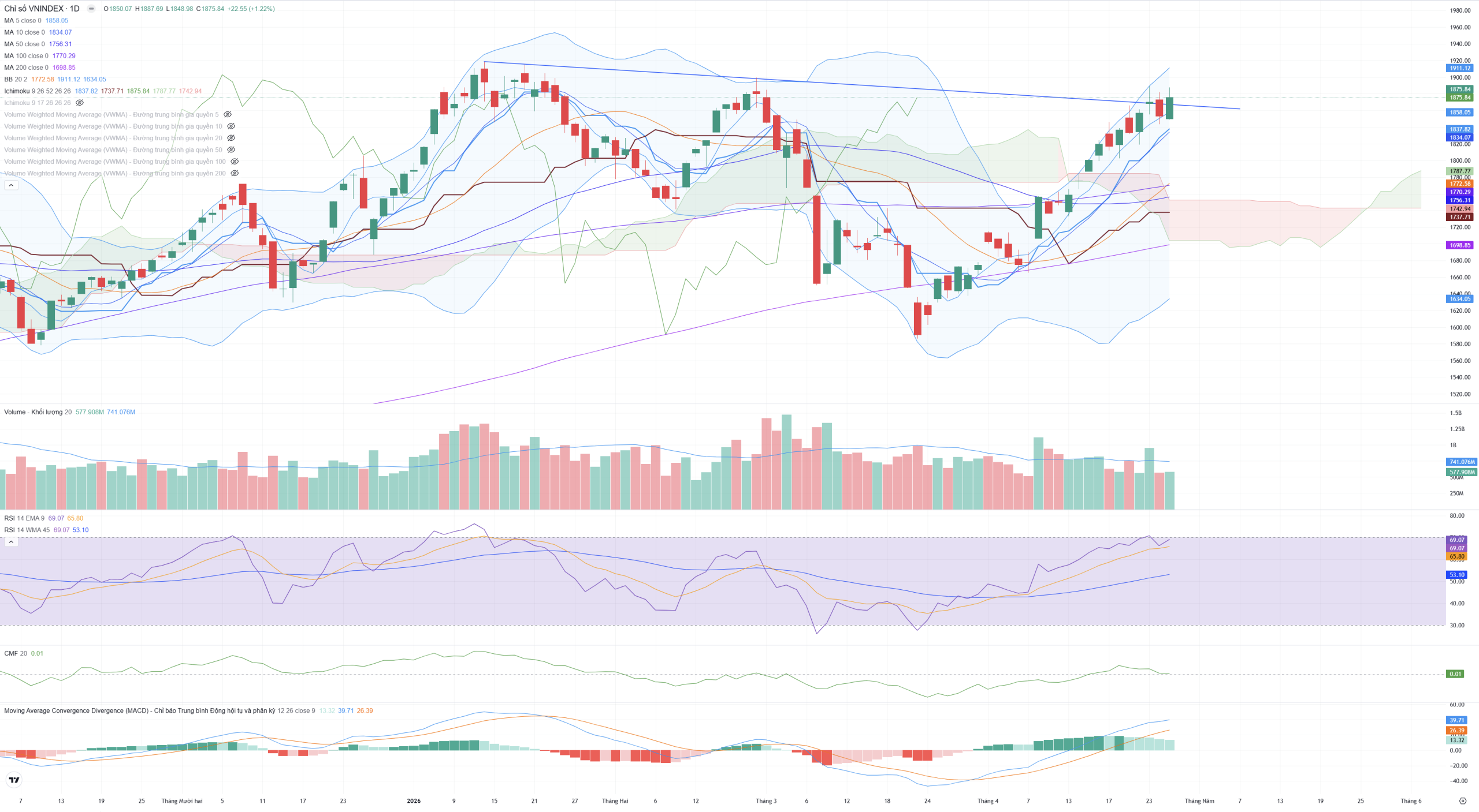 - Đồ thị Daily ghi nhận nến tăng điểm nhưng có bóng nến trên dài, cho thấy áp lực bán xuất hiện ngay khi chỉ số tiếp cận vùng đỉnh ngắn hạn xung quanh 1.880 – 1.890 điểm. Hiện tượng phân kỳ ẩn giảm giá (Hidden Bearish Divergence) vẫn duy trì khi giá chưa vượt được đỉnh cũ tháng 2 dù các chỉ báo động lượng đang ở mức cao.