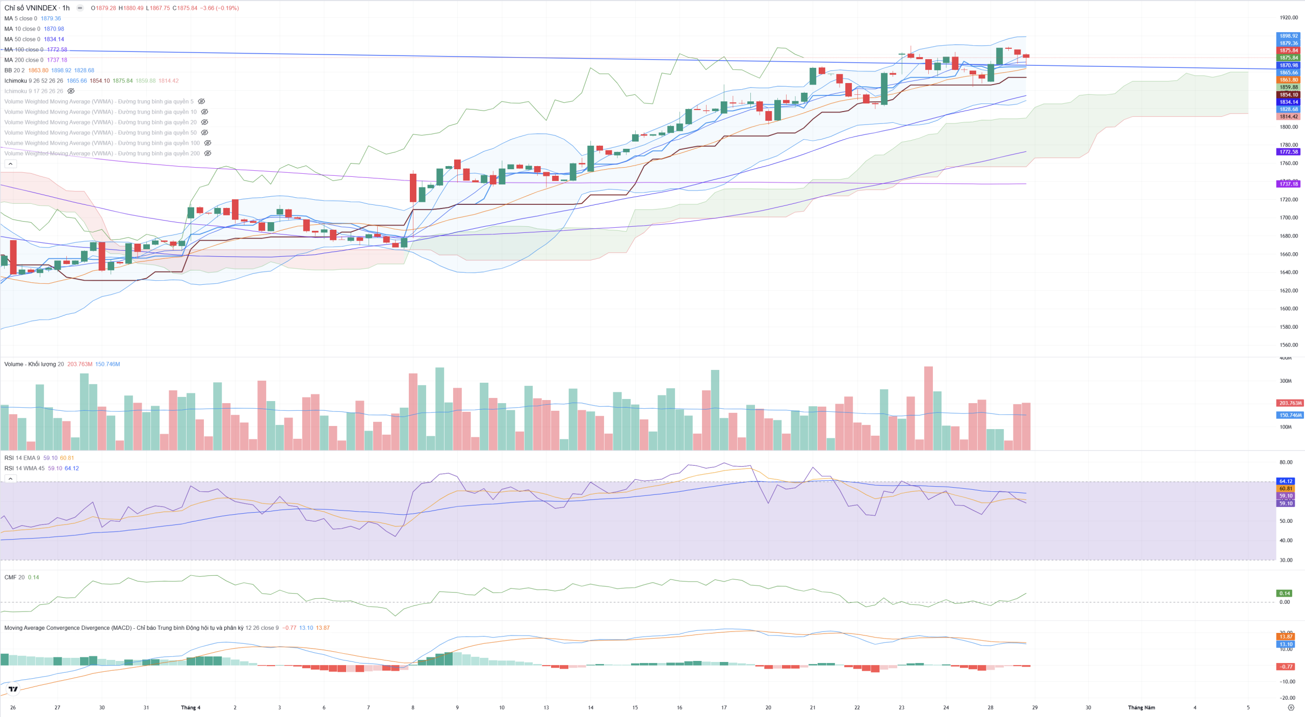 - Chi tiết nến giờ cuối: Mở cửa 1.879,28, Cao nhất 1.880,49, Thấp nhất 1.867,75, Đóng cửa 1.875,84.