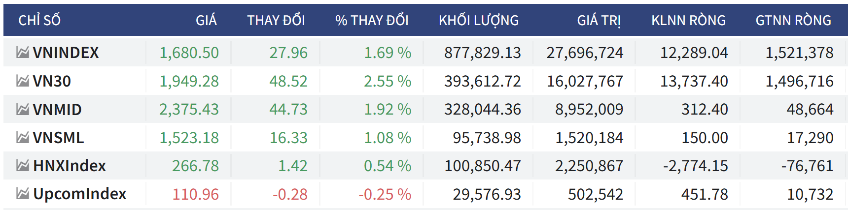 - Chốt phiên, VN-Index 27,96 điểm (+1,69%), lên 1.680,5 điểm; HNX-Index tăng 1,42 điểm (+0,54%), lên 266,78 điểm; UpCoM-Index giảm 0,28 điểm (-0,25%), xuống 110,96 điểm