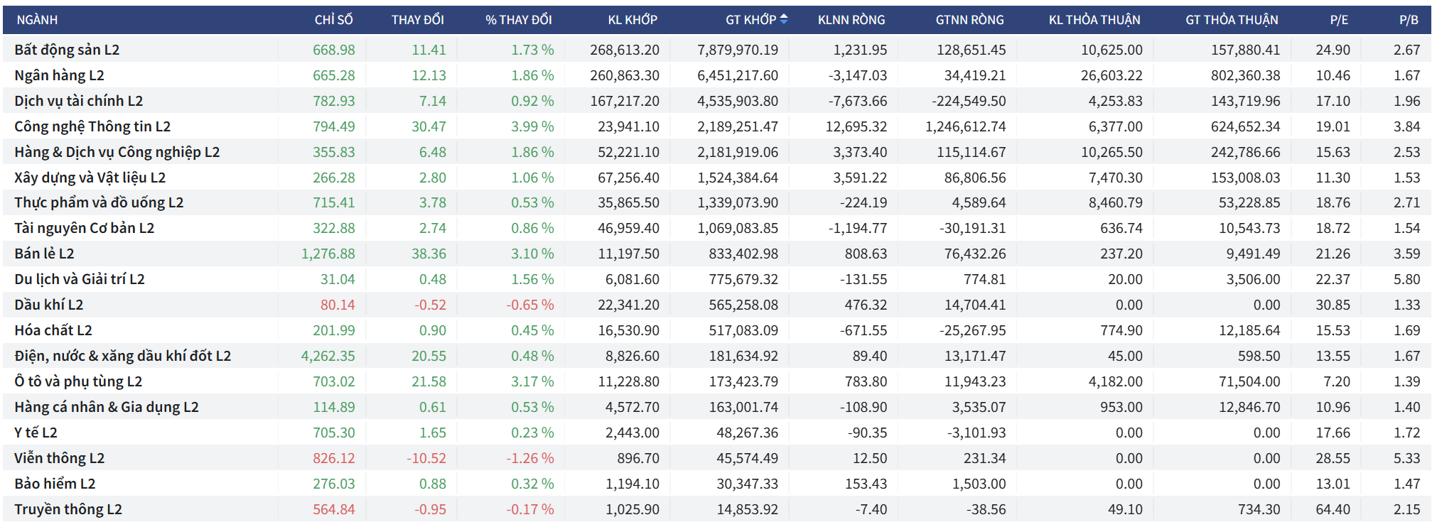 - Dầu khí giảm nhẹ -0.65% và Viễn thông giảm -1.26%, cho thấy sự phân hóa cục bộ.