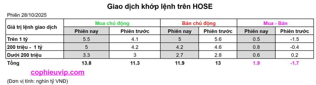 - Sự đồng thuận mua ròng của tất cả các nhóm: Cả ba nhóm nhà đầu tư (lớn, vừa, và nhỏ) đều thể hiện xu hướng mua ròng trong phiên 28/10/2025, cho thấy sự đồng thuận mua vào trên diện rộng.