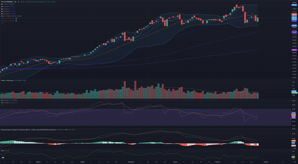 - Daily: Chỉ số nằm giữa Đường giữa BB và Dải dưới BB. Đường giữa BB (1,698.50) hiện là ngưỡng kháng cự cực kỳ quan trọng.