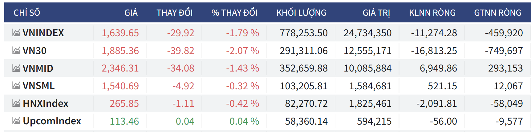 - Áp lực bán trên diện rộng: Toàn bộ các chỉ số chính đều giảm điểm mạnh. VNINDEX giảm -1.79% (đóng cửa tại 1,639.65 điểm). Mức giảm này là đáng kể, xóa bỏ thành quả hồi phục gần đây.