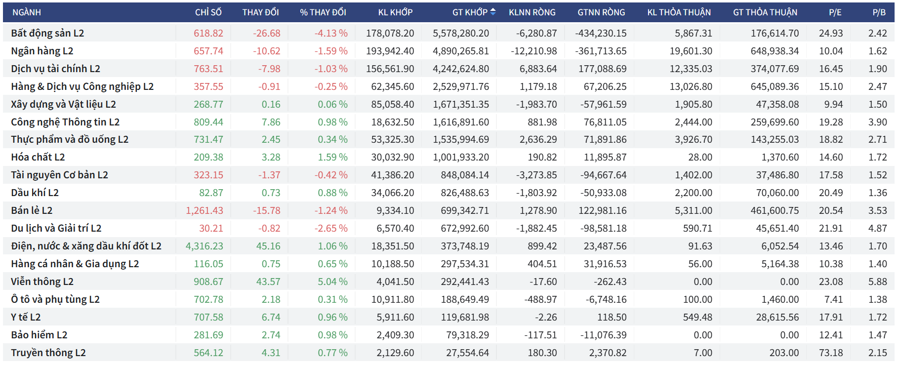 - Nhóm Bất động sản và Tài chính dẫn đầu đà giảm: Các nhóm ngành có giá trị giao dịch lớn nhất và chịu áp lực bán tháo mạnh nhất là: