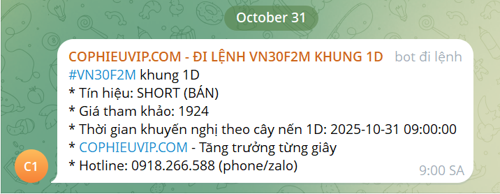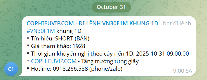 Bot phái sinh khung ngày hợp đồng 41I1FB000 đã cho lệnh Short lúc 09:00 ngày 31/10/2025 với mức giá tham khảo 1928. Lệnh này đang cho lợi nhuận 36 điểm so với giá đóng cửa.