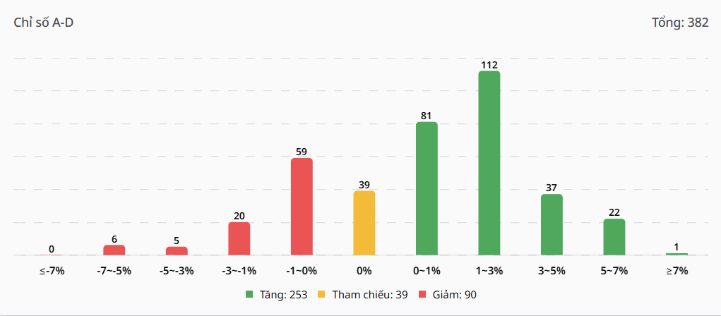- Tỷ lệ mã tăng chiếm khoảng 66% trên tổng số 382 mã giao dịch, cho thấy đà hồi phục diễn ra trên diện rộng ở tất cả các nhóm ngành.