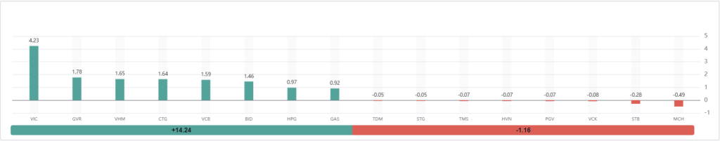 - Nhóm cổ phiếu kéo tăng điểm chiếm ưu thế áp đảo hoàn toàn với tổng mức đóng góp lên tới +14.24 điểm.