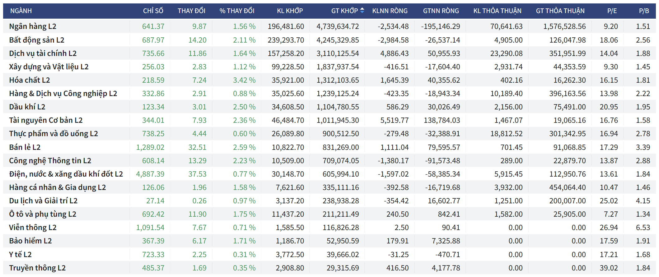- VNSML (Nhóm vốn hóa nhỏ): Chỉ số tăng +20.42 điểm (+1.46%) xuống mức 1,419.04 điểm. Giá trị giao dịch đạt 1,207.509 tỷ đồng. Khối ngoại mua ròng nhẹ +38.648 tỷ đồng.