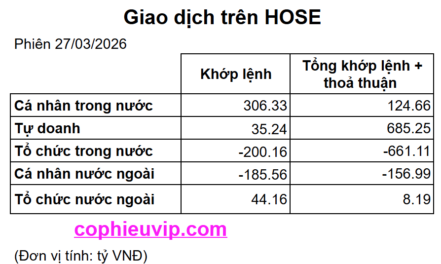 Phiên giao dịch ngày 27/03/2026 ghi nhận sự bùng nổ mạnh mẽ của nhóm cổ phiếu trụ, đặc biệt là sự dẫn dắt của “họ Vin” (VIC, VHM) và nhóm Ngân hàng quốc doanh (VCB, BID, CTG). Lực cầu tập trung vào các mã có vốn hóa lớn nhất sàn HOSE đã tạo ra sức bật lớn cho VN-Index. Áp lực bán ở chiều ngược lại gần như không đáng kể, cho thấy tâm lý lạc quan bao trùm và dòng tiền lớn đang quay trở lại nâng đỡ các cổ phiếu dẫn dắt thị trường.