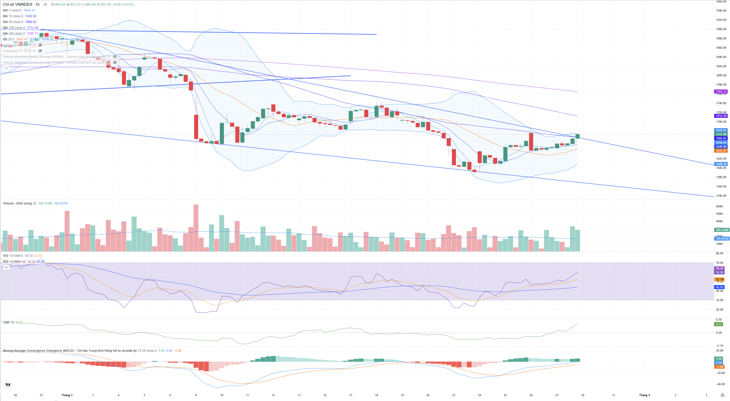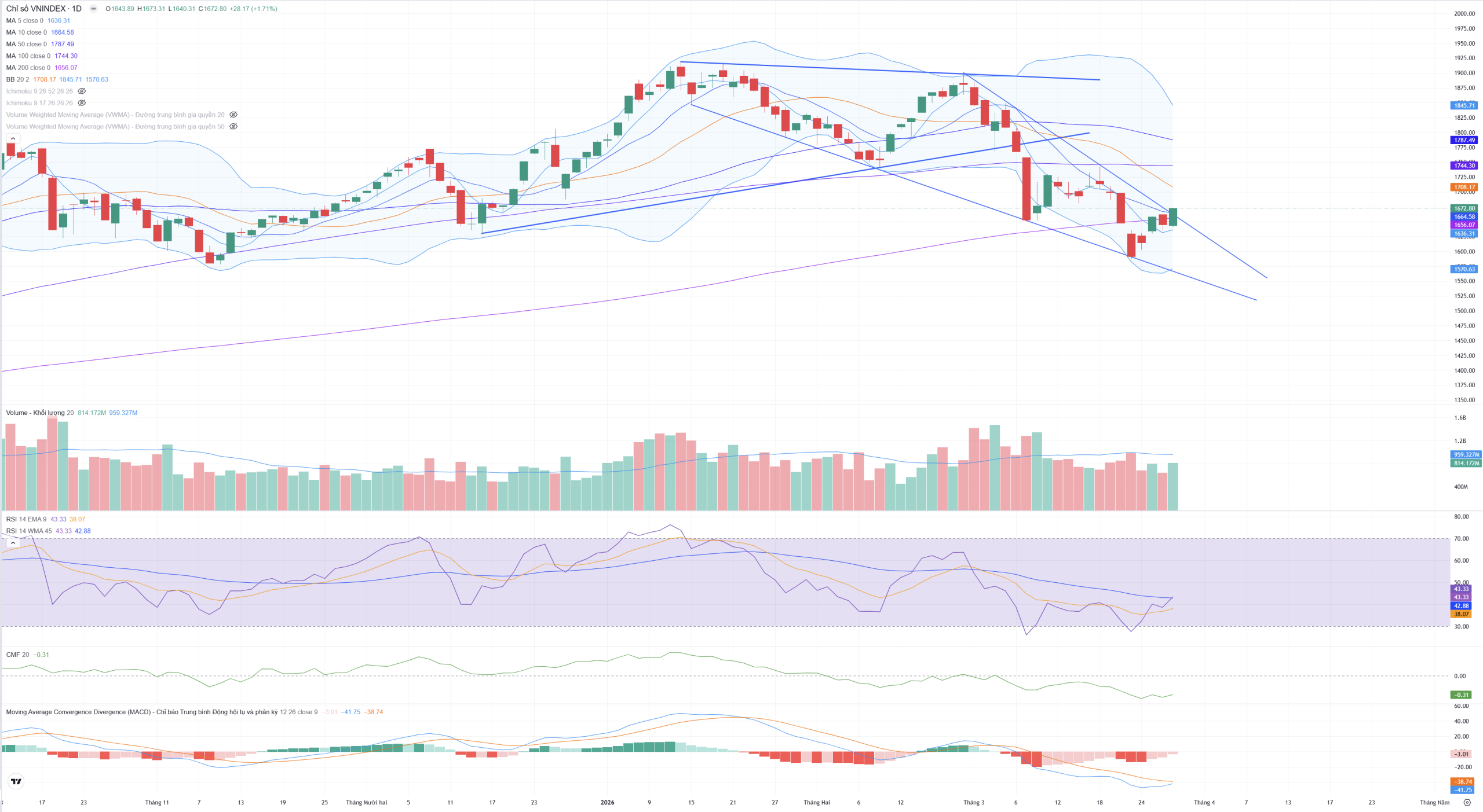 - Tuy nhiên, giá vẫn đang nằm dưới các đường trung bình quan trọng là MA20 (1,708.17) và MA50 (1,787.49). Đường MA20 vẫn đang dốc xuống mạnh, đóng vai trò là “ngưỡng cửa” quyết định xu hướng trung hạn.