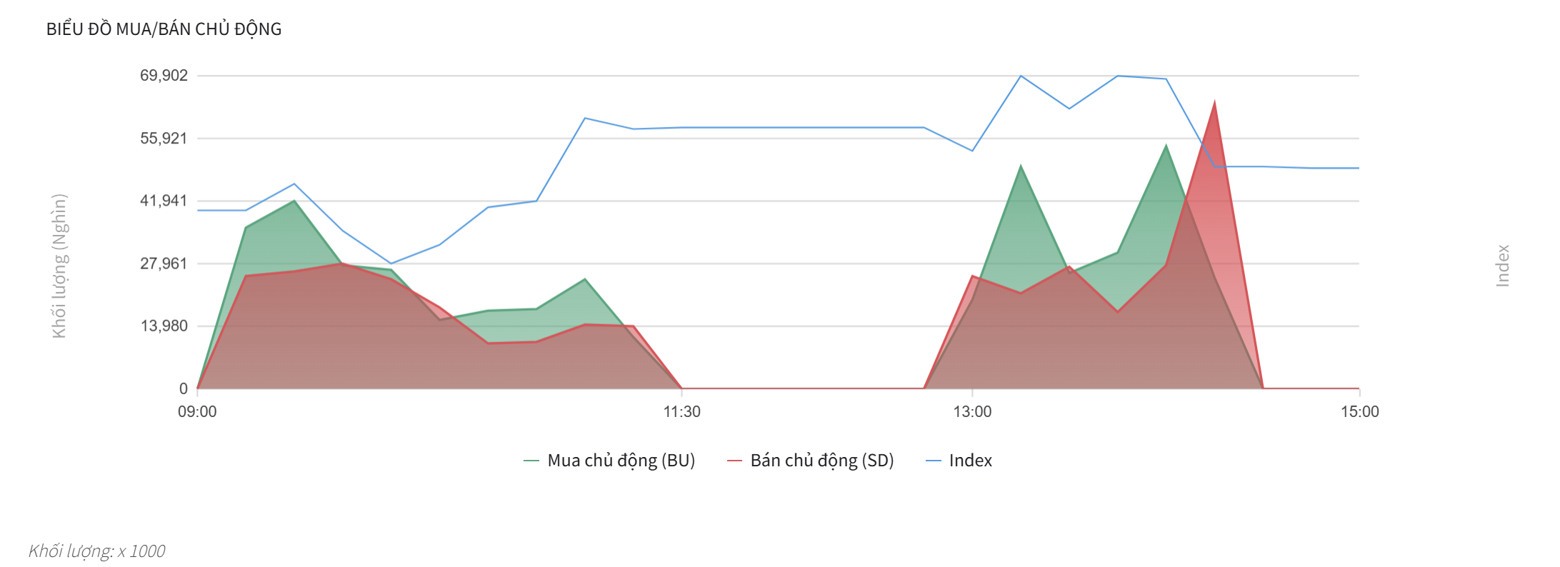 - Lực Mua Chủ động chiếm ưu thế: Ngay từ đầu phiên, Lực Mua chủ động (vùng Xanh) đã tăng mạnh và vượt qua Lực Bán chủ động (vùng Đỏ).