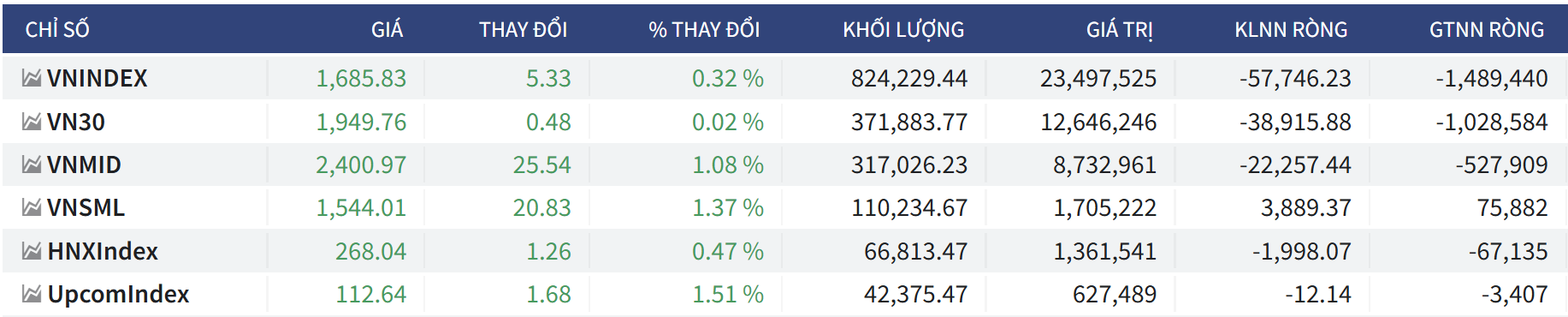 - Chốt phiên, VN-Index tăng nhẹ 5,33 điểm (+0,32%), lên 1.685,83 điểm; HNX-Index tăng 1,26 điểm (+0,47%), lên 268,04 điểm; UPCoM-Index tăng 1,68 điểm (+1,51%) lên 112,64 điểm