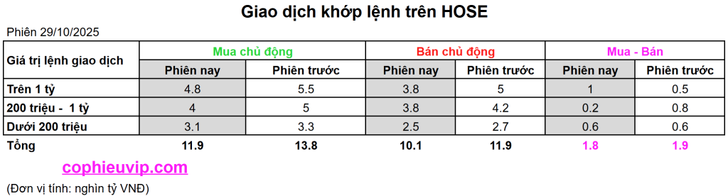 - Sự đồng thuận mua ròng của tất cả các nhóm: Cả ba nhóm nhà đầu tư (lớn, vừa, và nhỏ) đều thể hiện xu hướng mua ròng trong phiên 29/10/2025, cho thấy sự đồng thuận mua vào trên diện rộng.