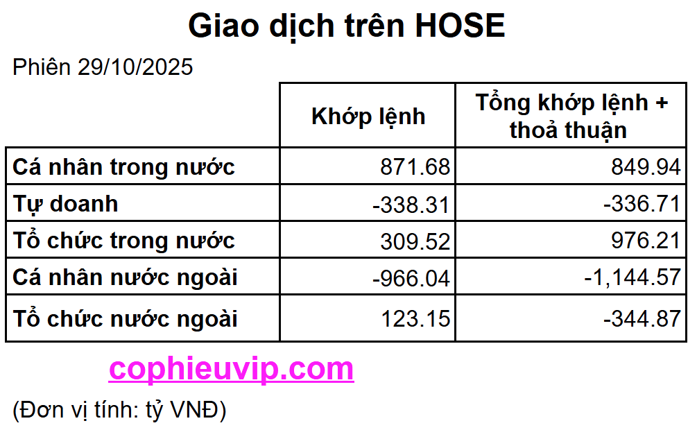 - Tổng Khối ngoại: Tổng cộng, khối ngoại bán ròng hơn 1,289 tỷ VND (tổng hợp), duy trì áp lực rút vốn cao.