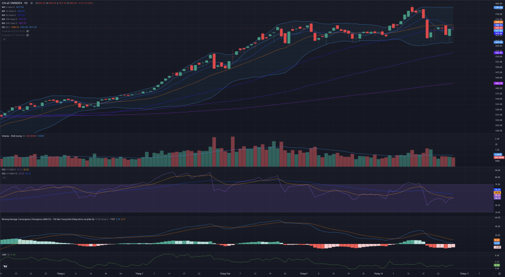 - Daily: Chỉ số nằm giữa Đường giữa BB và Dải dưới BB. Đường giữa BB (1,699.54) hiện là ngưỡng kháng cự gần nhất.