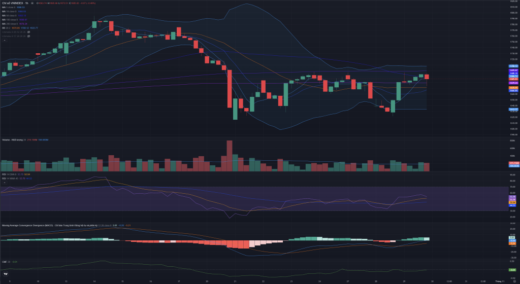 - Giá đóng cửa nằm dưới MA10 (1,693.76) và MA20 (1,699.54).