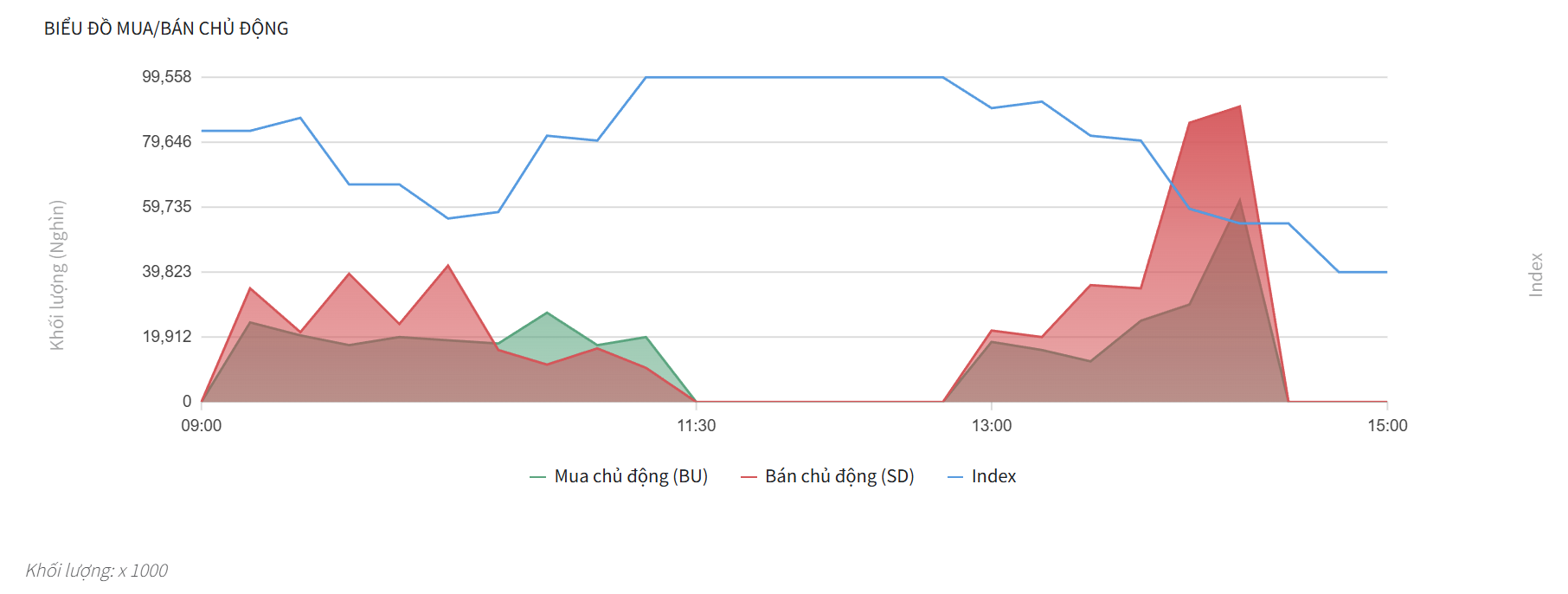 - Áp lực Bán gia tăng (13:00 – 14:00): Ngay khi mở cửa phiên chiều, lực Bán chủ động tăng mạnh, vượt qua lực Mua chủ động, khiến chỉ số VN-Index điều chỉnh giảm sâu.