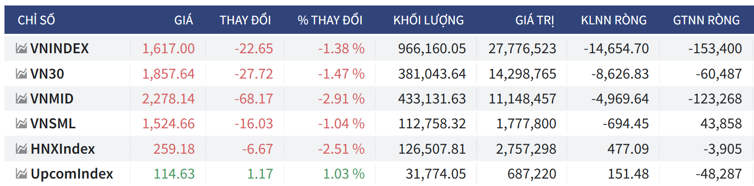- Chốt phiên, VN-Index giảm 22,65 điểm (-1,38%), xuống 1.617 điểm; HNX-Index giảm 6,67 điểm (-2,51%), xuống 259,18 điểm; UPCoM-Index tăng 1,17 điểm (+1,03%), lên 114,63 điểm