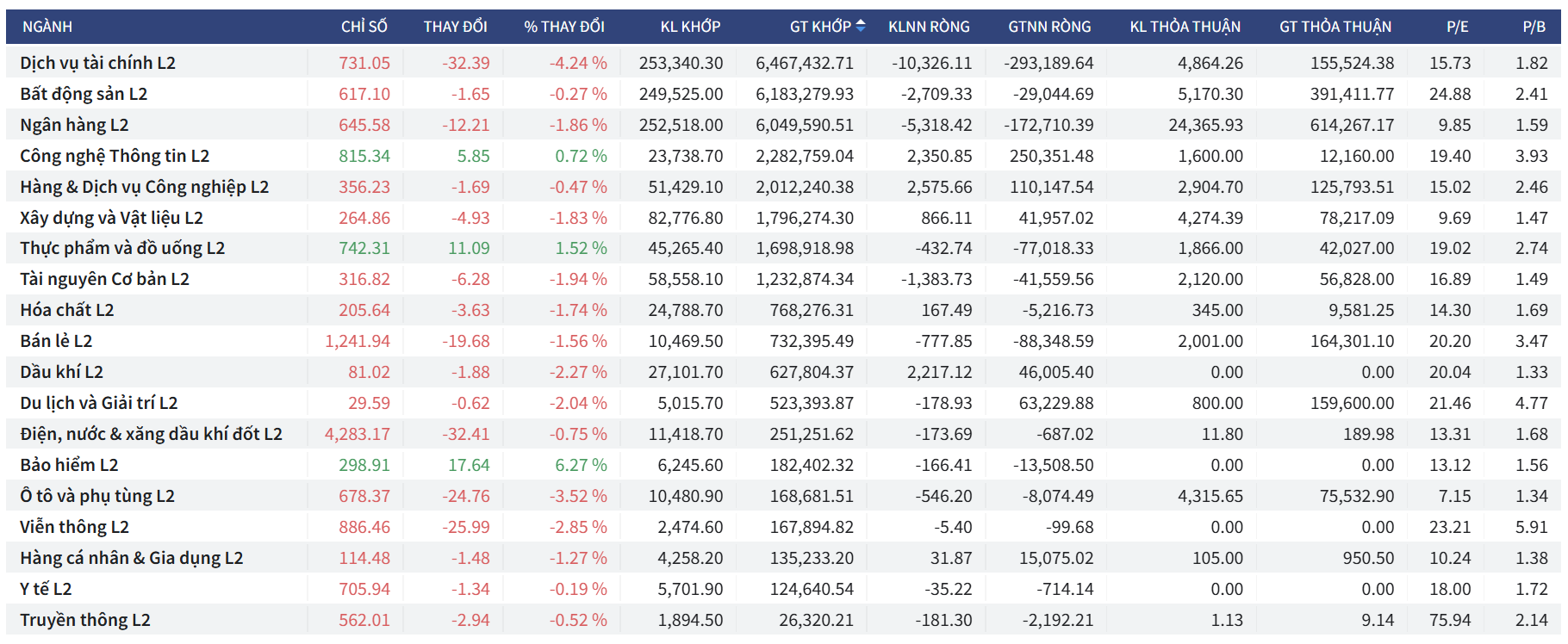 - Dịch vụ tài chính (Chứng khoán): Giảm mạnh -4.24% với thanh khoản cao nhất (6,467 tỷ VND).
