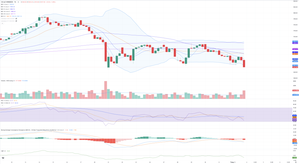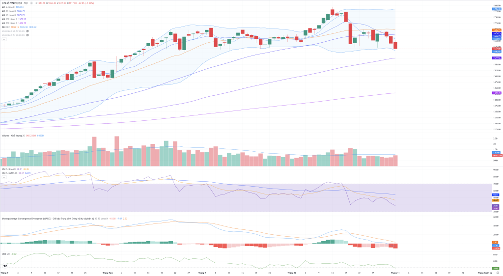 - Daily: Chỉ số đang tiến sát Dải dưới BB (1,606.92). Nếu thủng ngưỡng này, đà giảm sẽ được xác nhận.