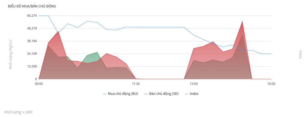 - Áp lực Bán Chủ động (SD) áp đảo: Ngay từ đầu phiên, lực Bán chủ động (vùng Đỏ) đã tăng vọt và chiếm ưu thế tuyệt đối so với lực Mua chủ động (vùng Xanh).