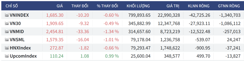 - Chốt phiên, VN-Index giảm 10,20 điểm (-0,60%), xuống 1.685,3 điểm; HNX-Index giảm 1,82 điểm (-0,66%), xuống 272,87 điểm; UpCoM-Index tăng 1,08 điểm (+0,99%), lên 110,24 điểm