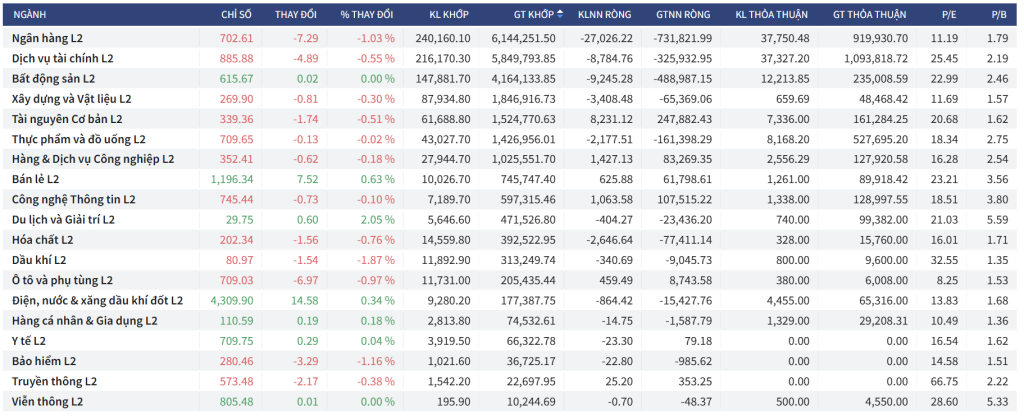- Ngân hàng: Giảm -1.03% với thanh khoản cao nhất (6,144 tỷ VND).