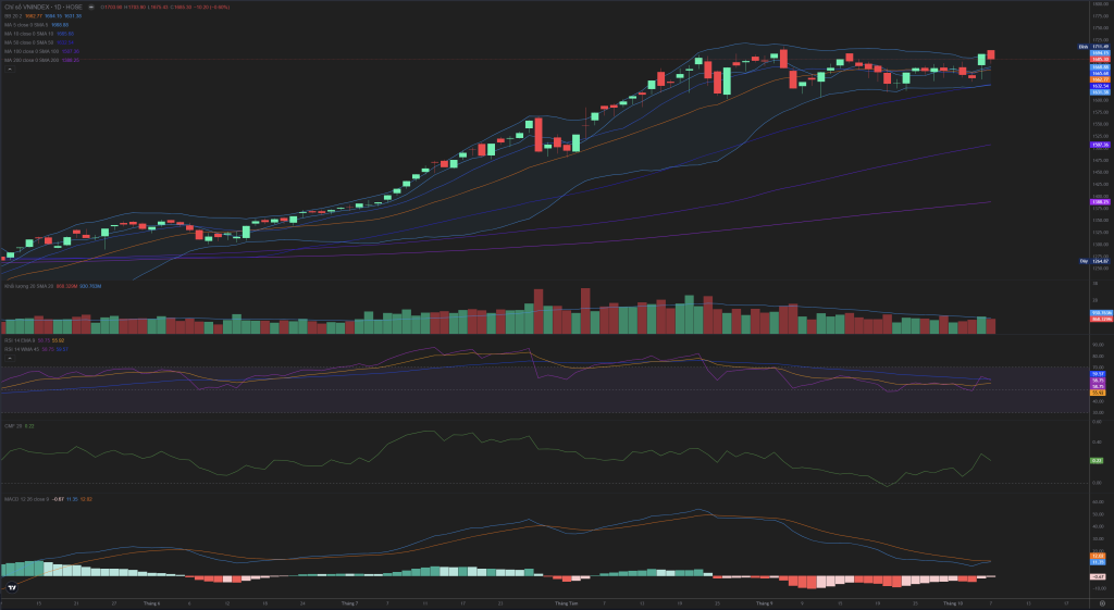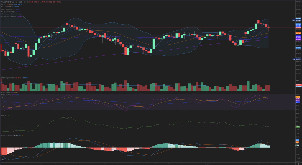 Về mặt kỹ thuật, phiên 07/10 là một nhịp điều chỉnh lành mạnh sau phiên bùng nổ, khi giá vẫn giữ vững trên các đường MA ngắn hạn (MA5, MA10) và xu hướng tăng ngắn hạn vẫn được bảo toàn. Tuy nhiên, áp lực bán chốt lời đã xuất hiện mạnh mẽ ở nhóm Mid-cap, và thanh khoản giảm cho thấy sự thận trọng đang chiếm ưu thế.