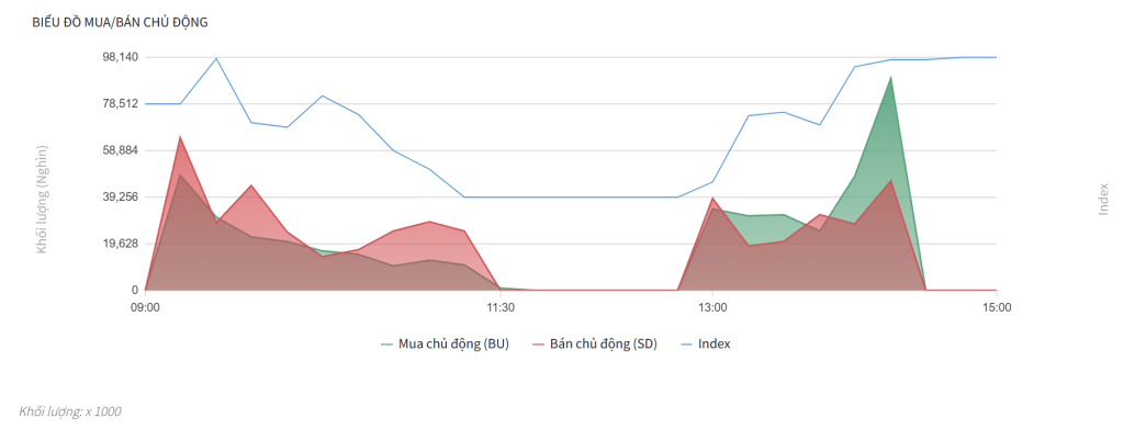 • Bùng nổ cuối phiên (Sau 14:00): Khoảng 14:00 – 14:30, lực Mua chủ động tăng vọt lần thứ hai, đạt đỉnh cao nhất trong cả phiên.